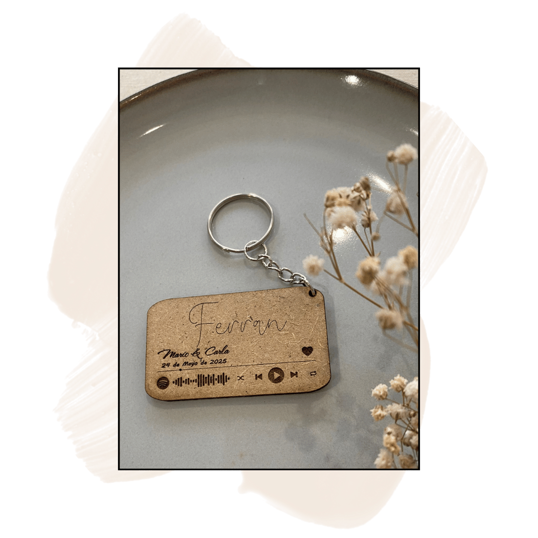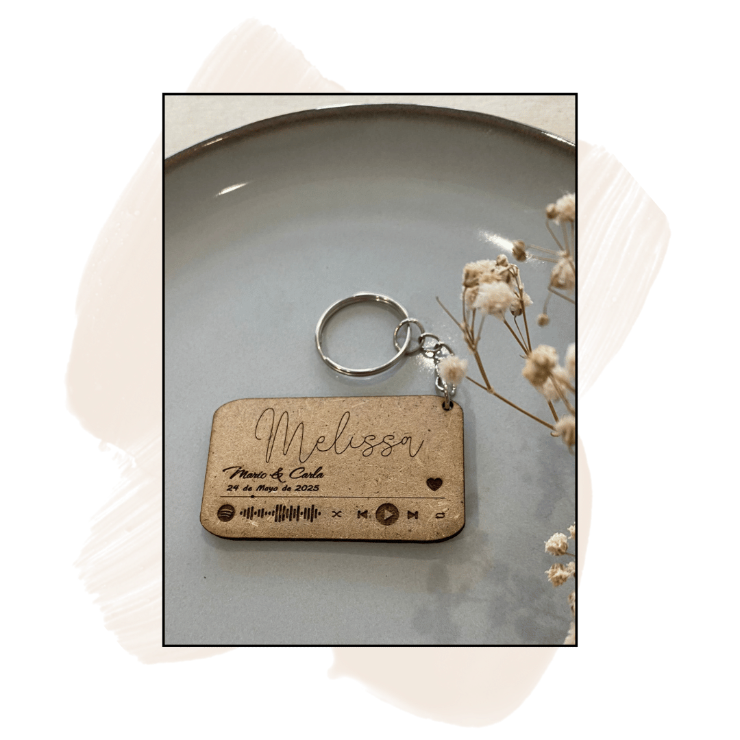 Marcasitios de boda en formato llavero de madera, personalizado con nombres, fecha y una canción de Spotify.